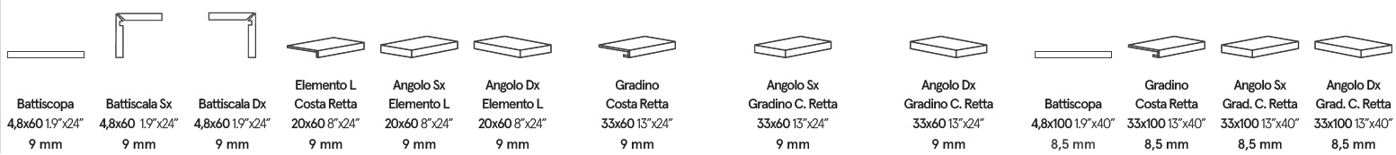 - 4,8x60 cm —> Costa Retta Ειδικό τεμάχιο για σοβατεπί. Διατίθεται με βαθμό αντί-ολίσθησης