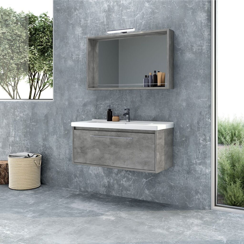 Έπιπλο μπάνιου με βάση από Μελαμίνη, νιπτήρα, καθρέφτη από Μελαμίνη και φωτιστικό.