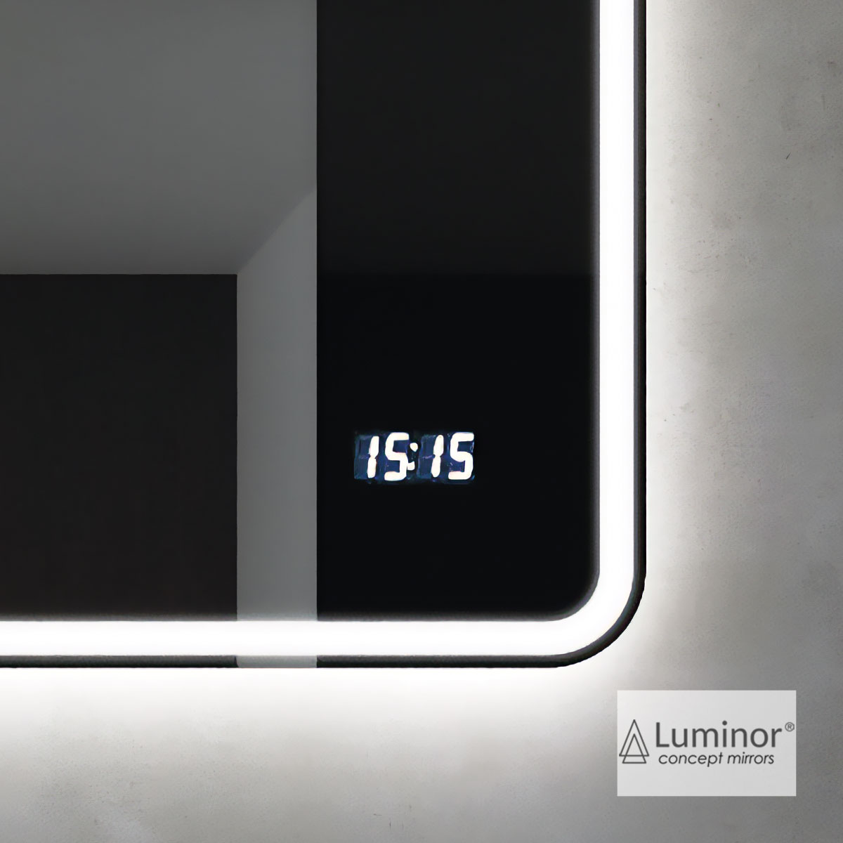 Φωτιζόμενος καθρέφτης “LED”, με ενσωματωμένο καθρέφτη μακιγιάζ Ø16, μεγενθυντικός x3 και ψηφιακό ρολόι. Σε διάσταση 100×80εκ.