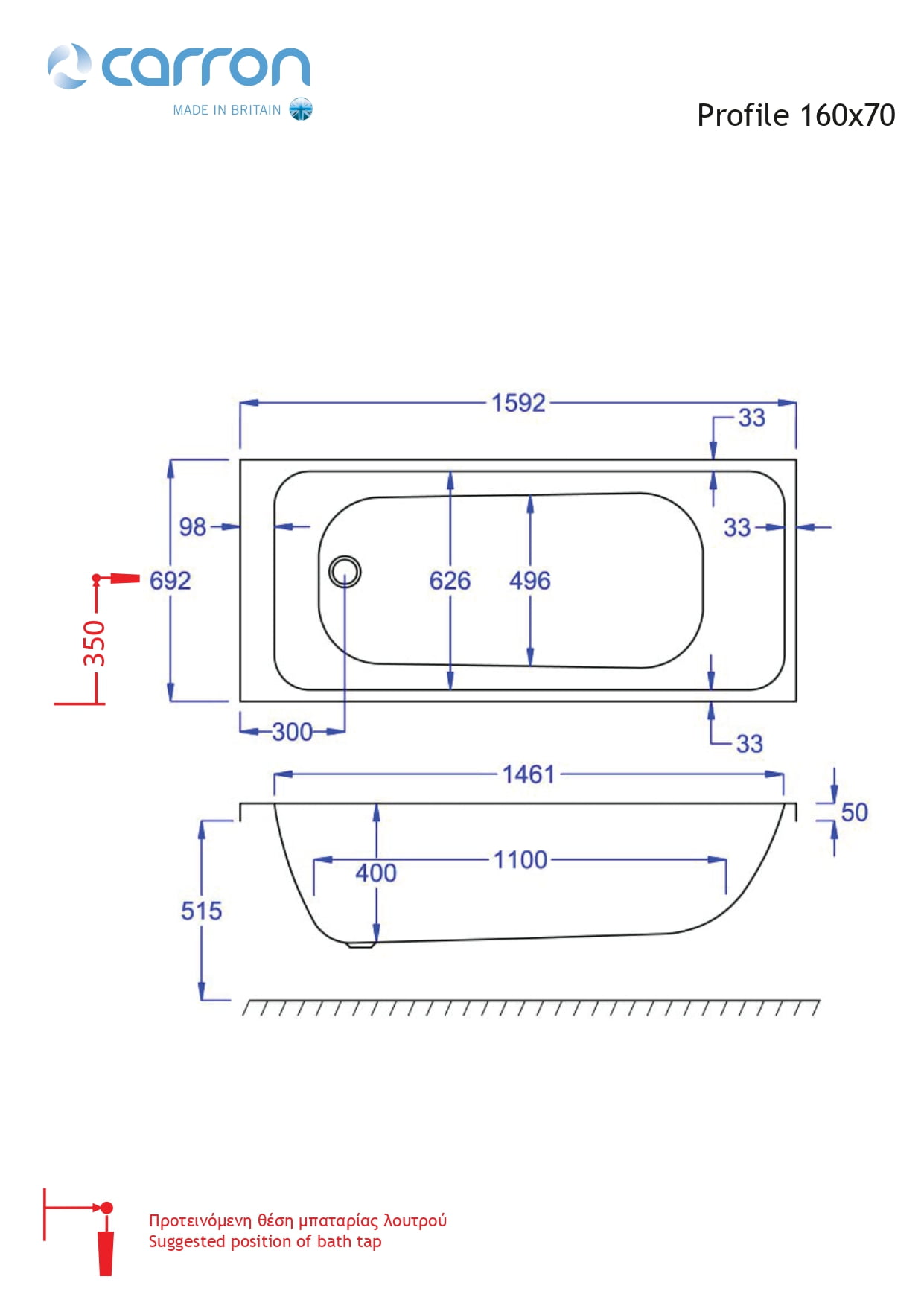 Μπανιέρα Carron Profile ένθετης τοποθέτησης. Με ξεχωριστό χαρακτηριστικό της τον ιδιαίτερο εργονομικό σχεδιασμό της, που της προσφέρει μεγαλύτερη χωρητικότητα σε σύγκριση με άλλες μπανιέρες του ίδιων διαστάσεων. Η σειρά Profile διατίθετε σε 3 διαφορετικές διαστάσεις, δίνοντας σας μεγαλύτερη ποικιλία επιλογής ανάλογα με τον διαθέσιμο χώρο σας αλλά και τη προτίμηση σας. Επίσης σας δίνει τη δυνατότητα επιλογής αν θέλετε να είναι απλά ακρυλική ή ακρυλική με ενίσχυση Carronite.