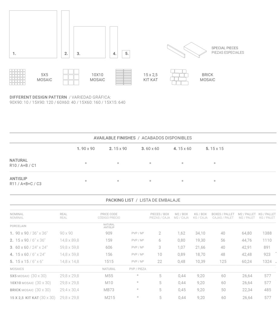 Η σειρά συμπληρώνεται από mosaics (5×5, 10×10, brick) καθώς και το εμβληματικό Kit Kat 15×2,5, ιδανικά για επιφάνειες με έντονη γραμμικότητα και αρχιτεκτονική λεπτομέρεια.