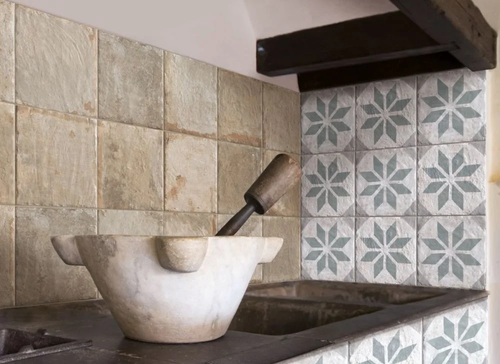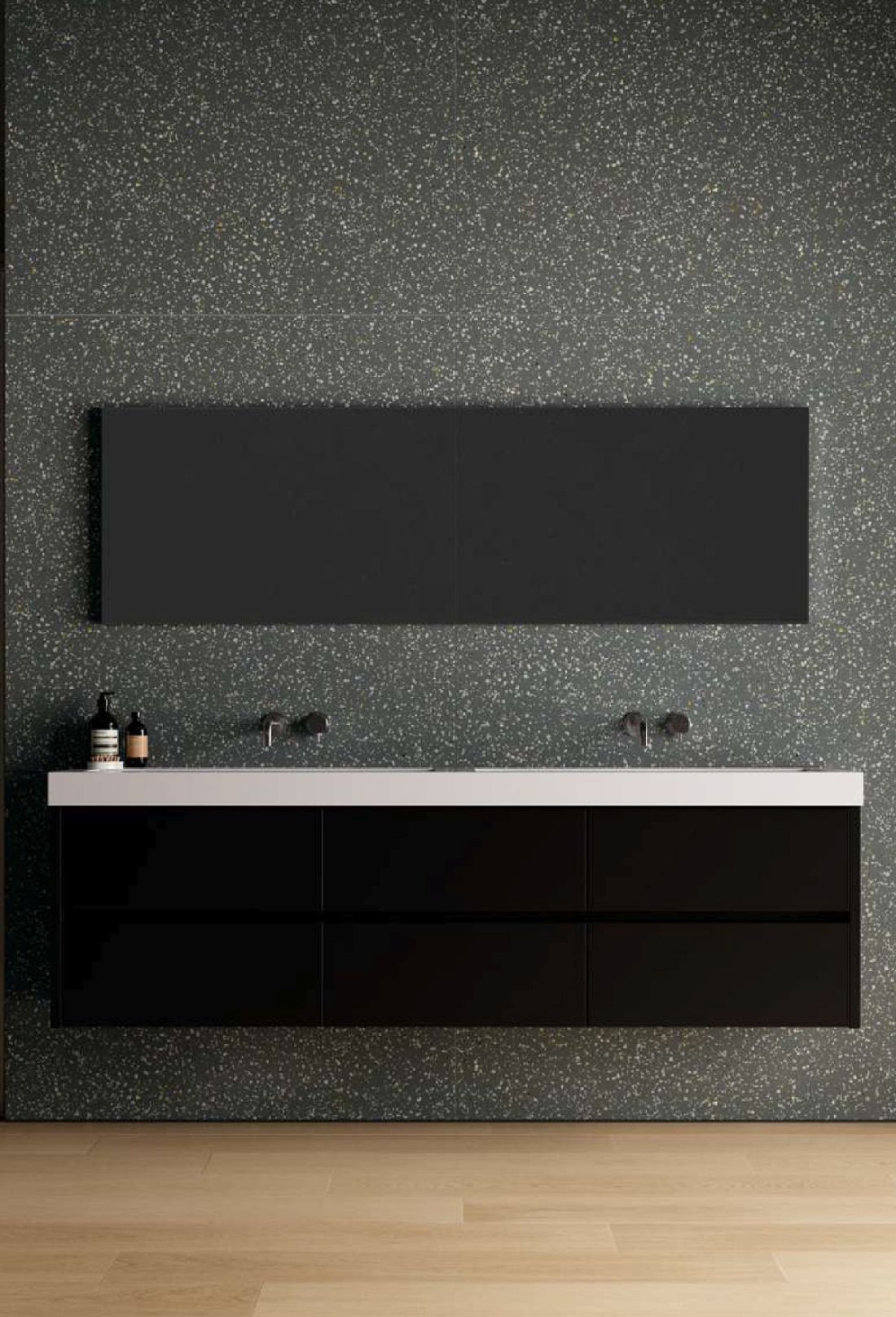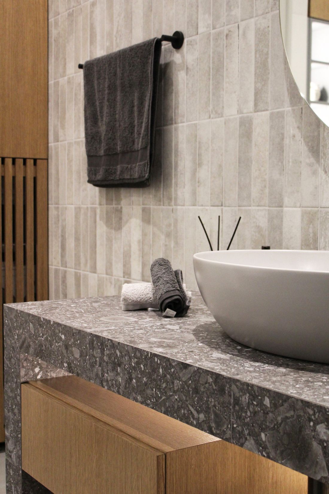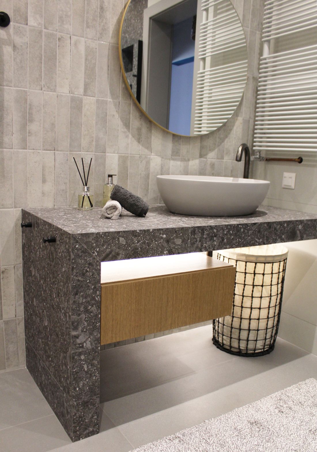 Παρατηρείστε καλά τις όμορφες εναλλαγές. Tουβλάκια που αποδίδουν ένα πιο βιομηχανικό στυλ, παντρεύονται άψογα με ένα άκρως minimal μονόχρωμο αυστηρό πλακάκι σε διάσταση 60×120 και μαζί έρχονται να αναδείξουν και να αναδειχτούν μέσα από την επαφή τους με το τρίτο πλακάκι που έχει την πιο σκληρή απόχρωση (σχεδόν μαύρο) και την επιβλητική οπτική απομίμηση του πετρώματος Ceppo Di Gres.