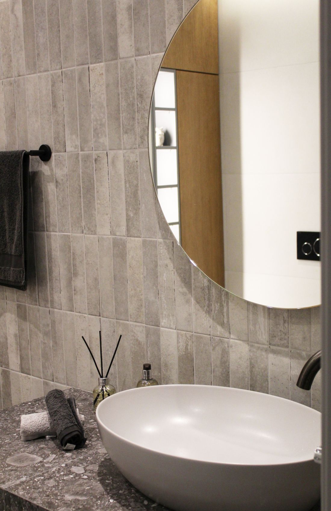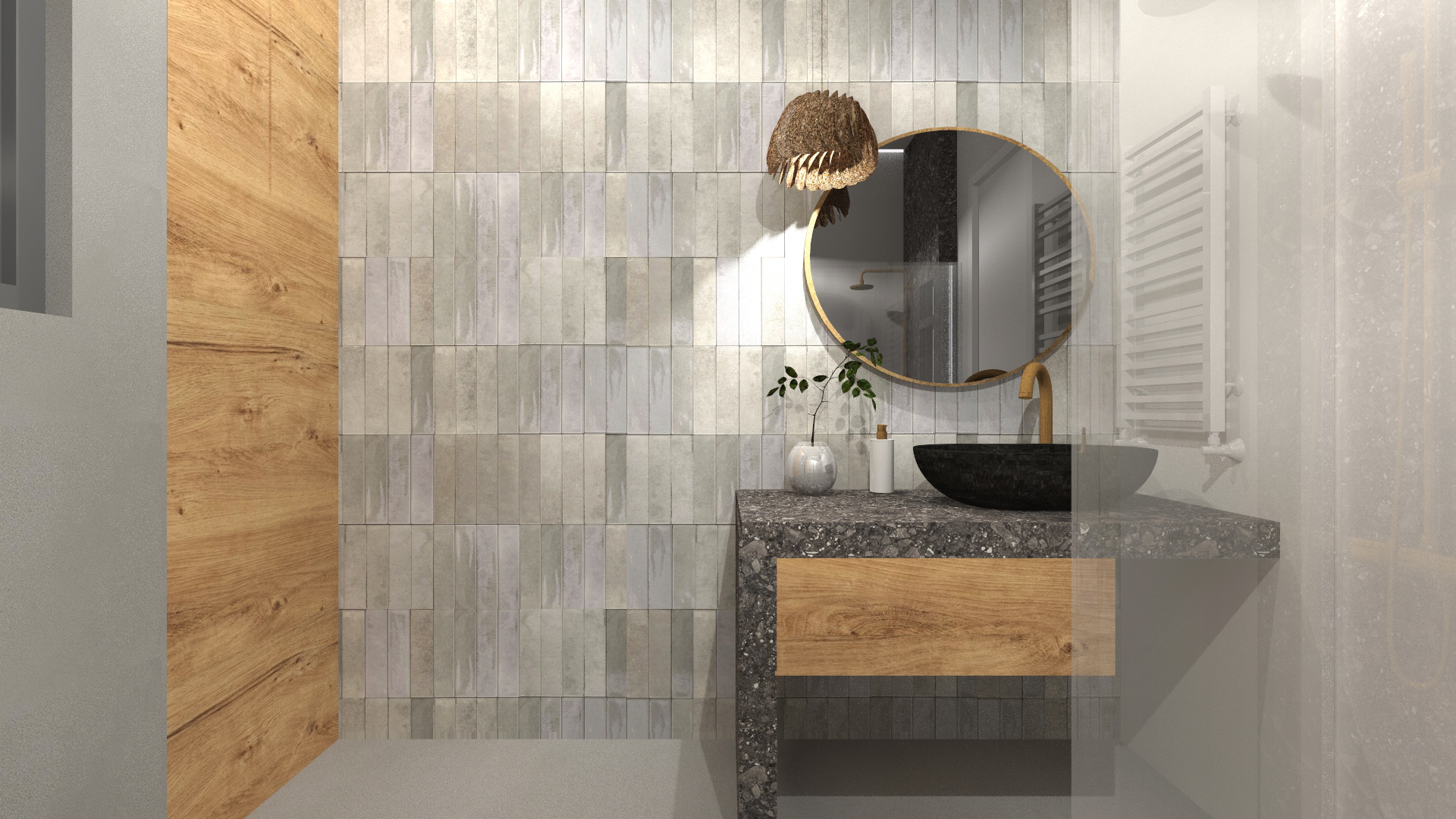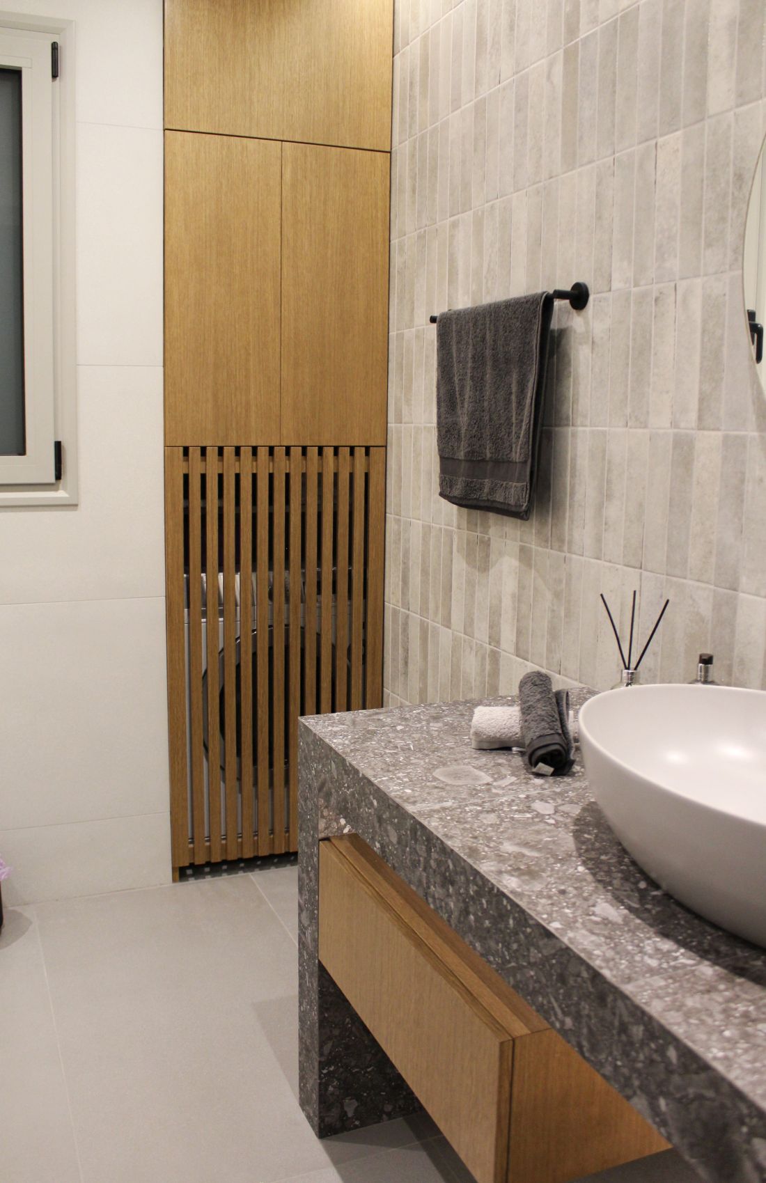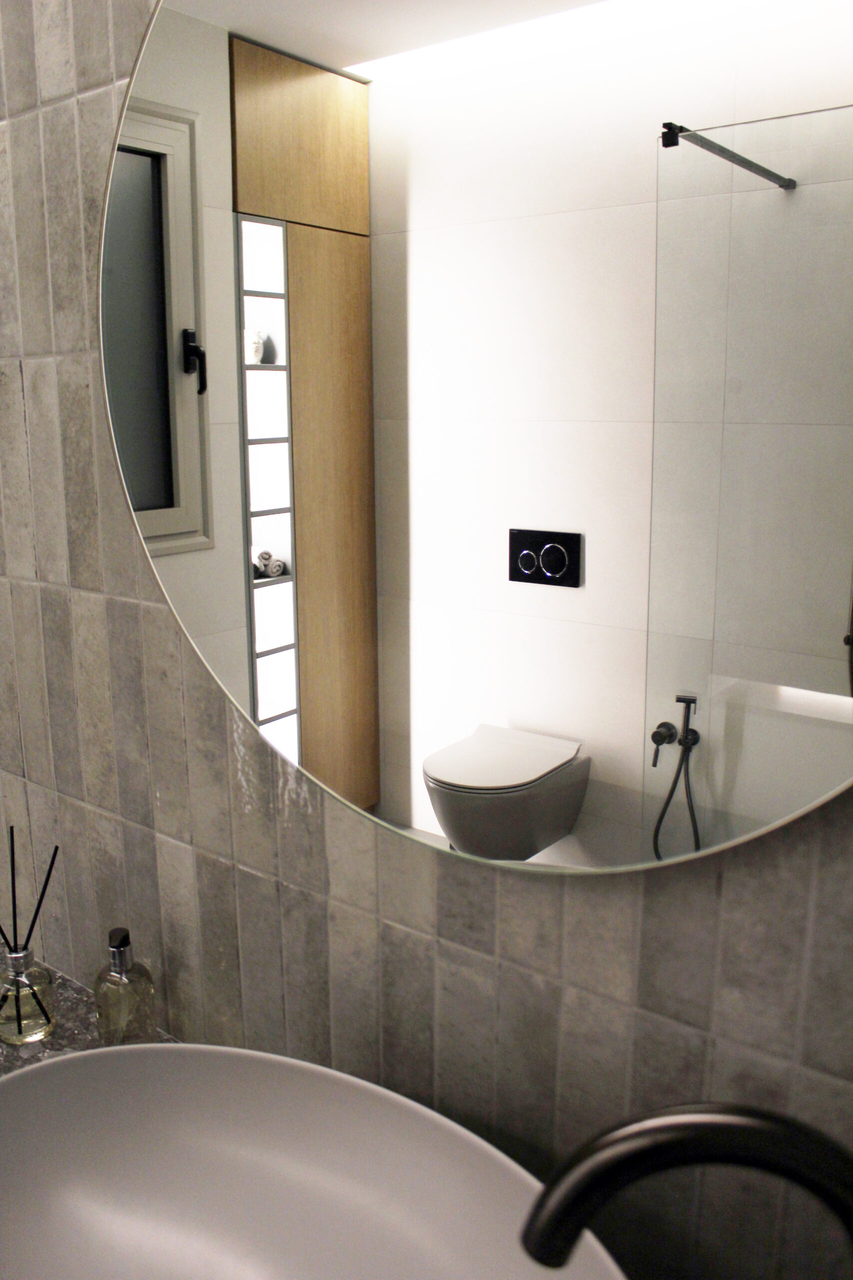Η ανακαίνιση αυτού του μπάνιου ήταν μια όμορφη αφορμή για εμάς να αναδείξουμε πώς μπορεί σε ένα τυπικό αθηναϊκό μπάνιο διαμερίσματος, να γίνει ένας συνδυασμός διαφορετικών πλακιδίων ως προς το ύφος, το μέγεθος, τις υφές και το αποτέλεσμα να ισορροπεί.
