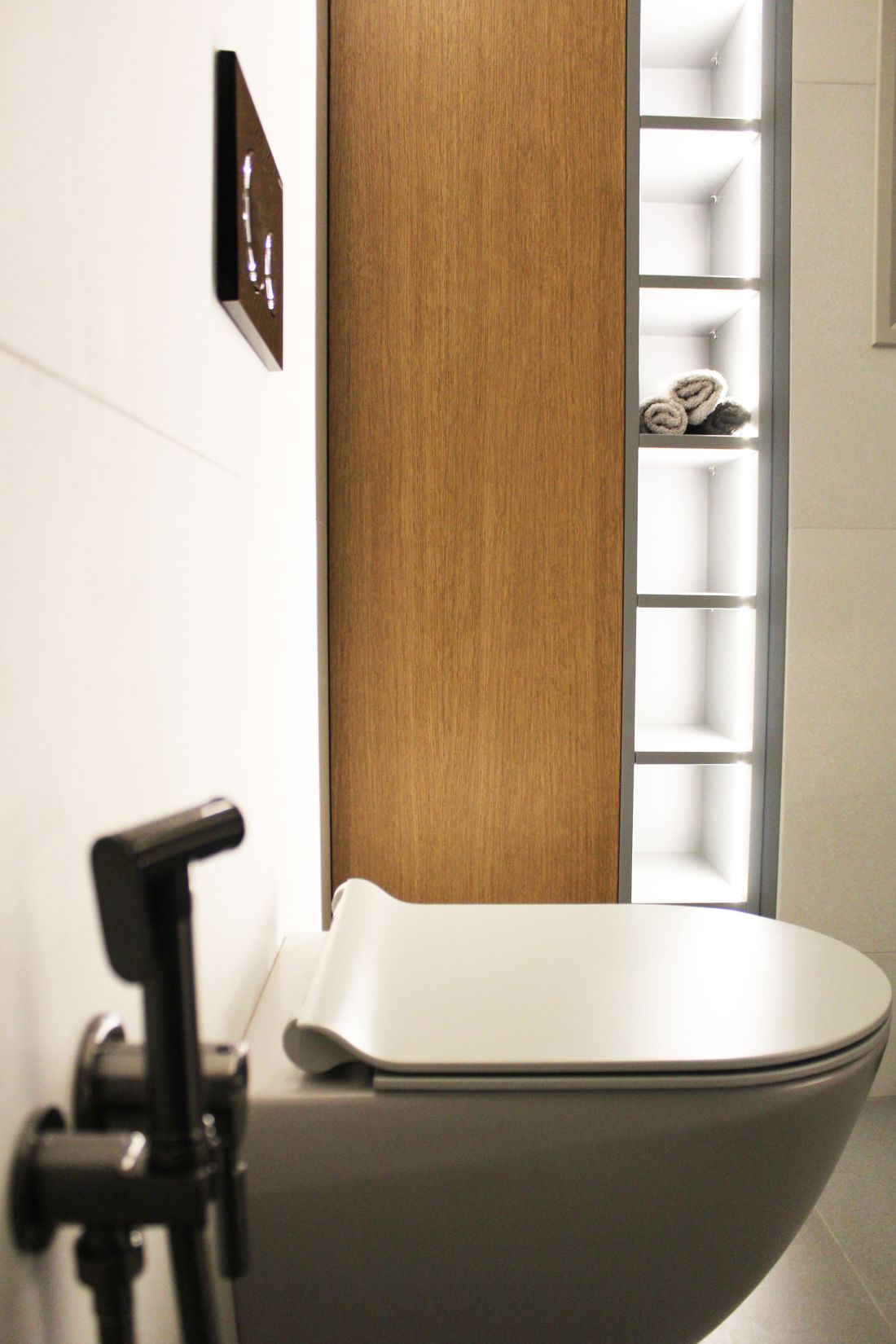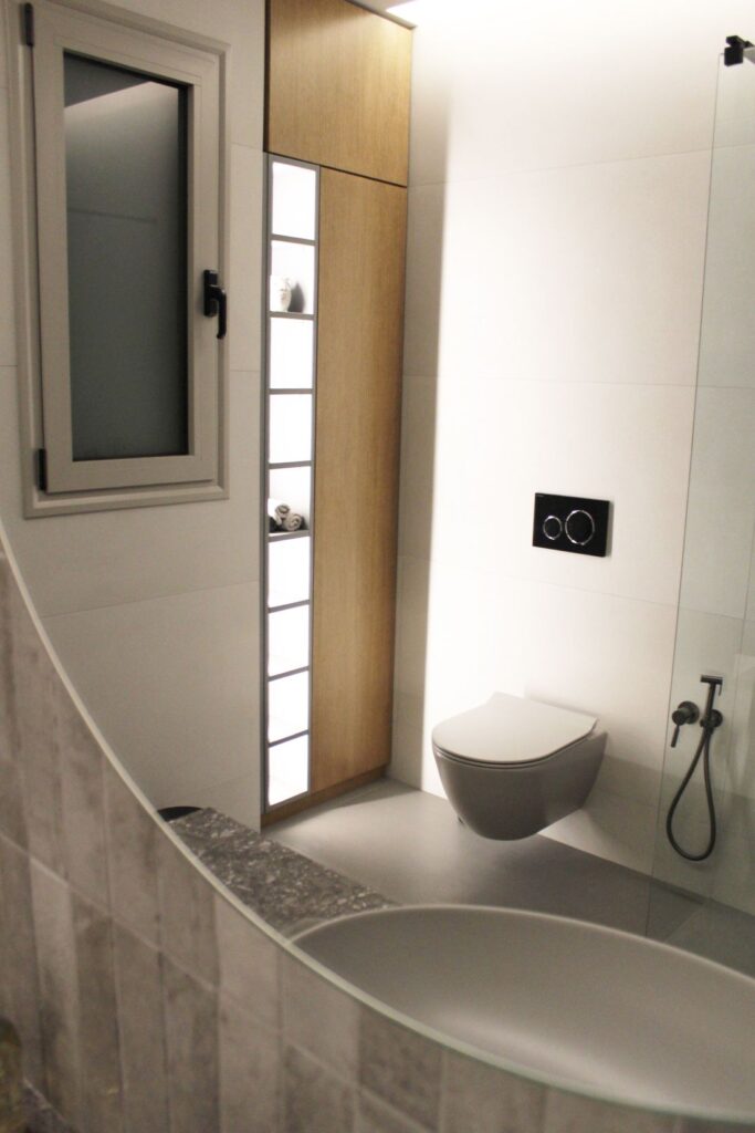 Σεβόμενοι ότι για την οικογένεια του σπιτιού ήταν απαραίτητοι οι αποθηκευτικοί χώροι αλλά και η αίσθηση του εντυπωσιασμού κάθε φορά που θα εισέρχεσαι στον χώρο, αξιοποιήσαμε κάθε δυνατή ανάπτυξη του χώρου. Έτσι εκμεταλευτήκαμε τις εσοχές που διέθεται εξαρχής το μπάνιο ως αποθηκευτικούς χώρους δίνοντας ταυτόχρονα και μια διακοσμητική διάθεση μέσω μικρών ανοιγμάτων- ραφιών με κρυφούς φωτισμούς.