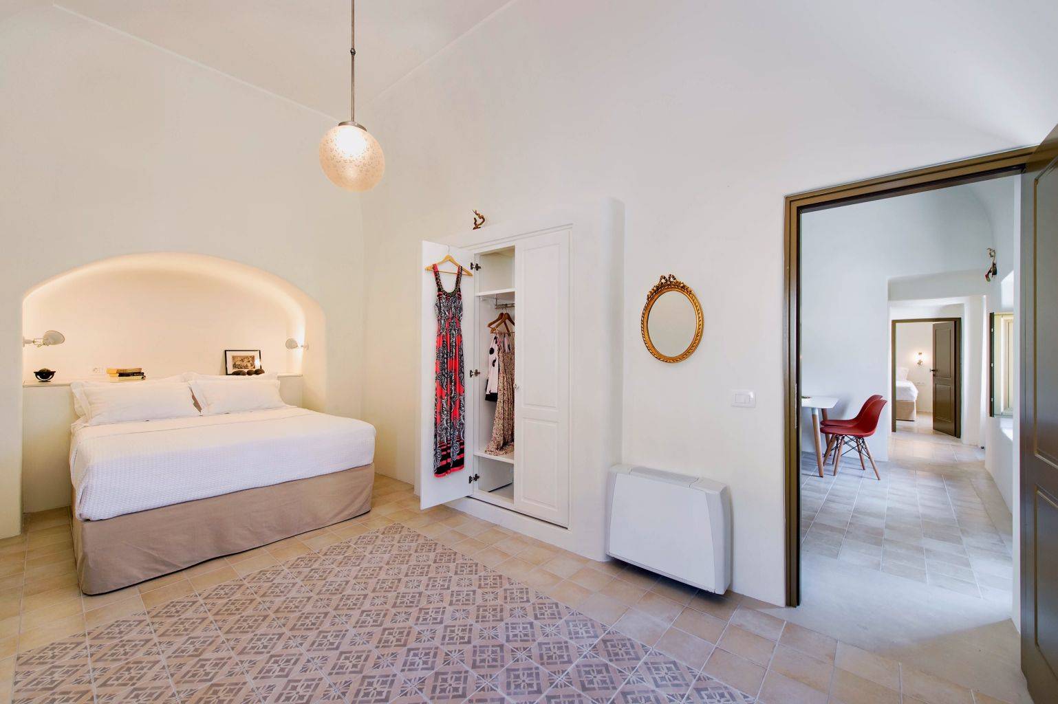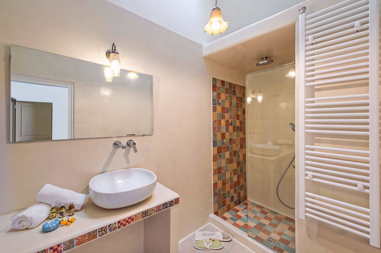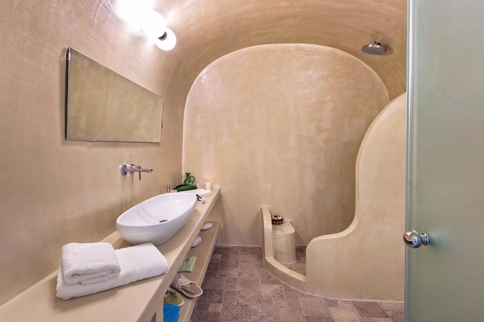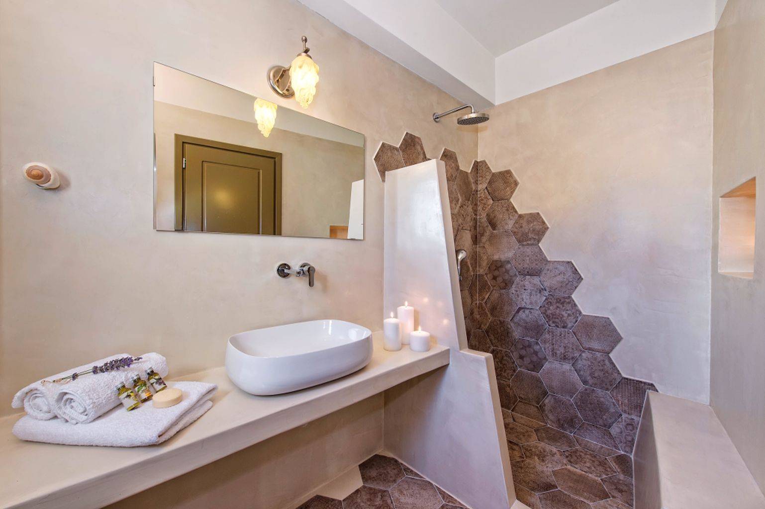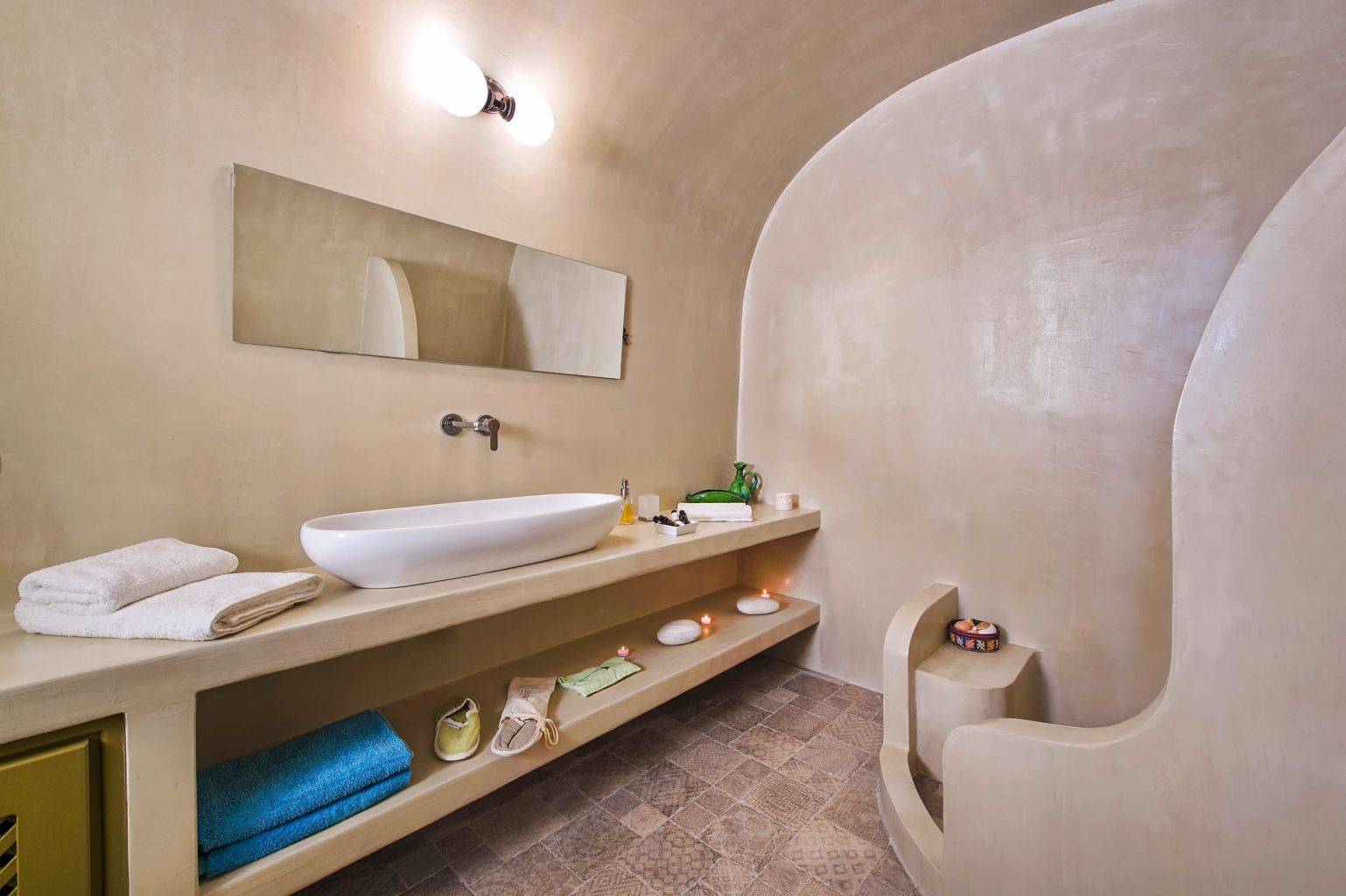 Mantilida Villa Santorini, ένα έργο που φτιάχτηκε με πολύ μεράκι από τους ιδιοκτήτες τους. Δεν θα μπορούσαμε να μην τους ακολουθήσουμε καθώς το έργο τους το αγαπήσαμε από την πρώτη στιγμή. Όταν ο χώρος αποπνέει σεβασμό για την ιστορία του η ευθύνη για την επιλογή των υλικών στο σήμερα αυξάνεται. Βρίσκεται στο Εμπορείο της Σαντορίνης, ένα μέρος που κάποτε ήταν το πέρασμα των έμπορων από όλο τον κόσμο για να προμηθευτούν τα περιζήτητα παραδοσιακά προϊόντα που ο ευλογημένος τόπος παρήγαγε. Ο συνειρμός αυτόματος … υλικά που αντέχουν στην καταπόνηση και στην αυξημένη κινητικότητα. Χαρακτηριστικό επίσης γνώρισμα στην Σαντορίνη του τότε ήταν ότι τα δάπεδα τα κοσμούσαν πλακάκια με σχέδια και κάθε χώρος είχε το δικό του σχέδιο. Με κριτήριο αυτά τα δύο χαρακτηριστικά η επιλογή ήταν ο ιταλικός οίκος Arkadia, με την σειρά Novecento. Τόσο στην Κάναβα όσο και στο Μεγάλο σπίτι χρησιμοποιήσαμε σαν βάση το Cemento Avorio 20×20 και στα υπνοδωμάτια παίξαμε άλλοτε με το Petali Grigio 20×20 άλλοτε με τα Versailes Grigio 20×20 ενώ άλλοτε με τα Trianon Grigio 20×20. Πλακάκια πολύ υψηλών προδιαγραφών που υπόσχονται να παραμείνουν αναλλοίωτα στον χρόνο. Τόσο για την αισθητική τους όσο και για την ποιότητα τους. Οι παραγωγοί τους έχουν φέρει την παλαιότητα τους στην επιφάνεια τους παρουσιάζοντας κάποιες σκιάσεις και φυσικές αλλοιώσεις στους τόνους για να δείξουν ότι μετράνε χρόνια τοποθετημένα. Η σκέψη για το στήσιμο της κουζίνας είχε αρχίσει ήδη να αναφέρεται. Δεν ήταν πρόβλημα όμως, καθώς γνωρίζαμε ότι θα ακολουθήσουμε την ίδια σειρά. Το πρόβλημα ήρθε όταν δεν ξέραμε τι να διαλέξουμε. Τελική επιλογή ήταν το Fiore Rosso 20×20 για την κατασκευή του πάγκου και η Fascia Fiore Rosso 20×20 για την επένδυση του τοίχου της κουζίνας. Ποτέ δεν θα ξεχάσουμε τις περιγραφές για την φυσική εσοχή για τις εστίες της ηλεκτρικής κουζίνας. Το επόμενο βήμα ήταν να δημιουργήσουμε τα μπάνια των χώρων. Είχαμε σαν αφετηρία μας το χαρακτηριστικό γνώρισμα του κυκλαδίτικου νησιού που δεν είναι άλλο από τις καμπύλες των τοίχων. Ήταν δεδομένο ότι η πατητή τσιμεντοκονία θα κυριαρχούσε στον χώρο καθώς είναι το μοναδικό υλικό που θα μπορούσε να ακολουθήσει αυτή την ροή. Αυτό που ψάχναμε είναι το κάτι διαφορετικό στα σημεία.