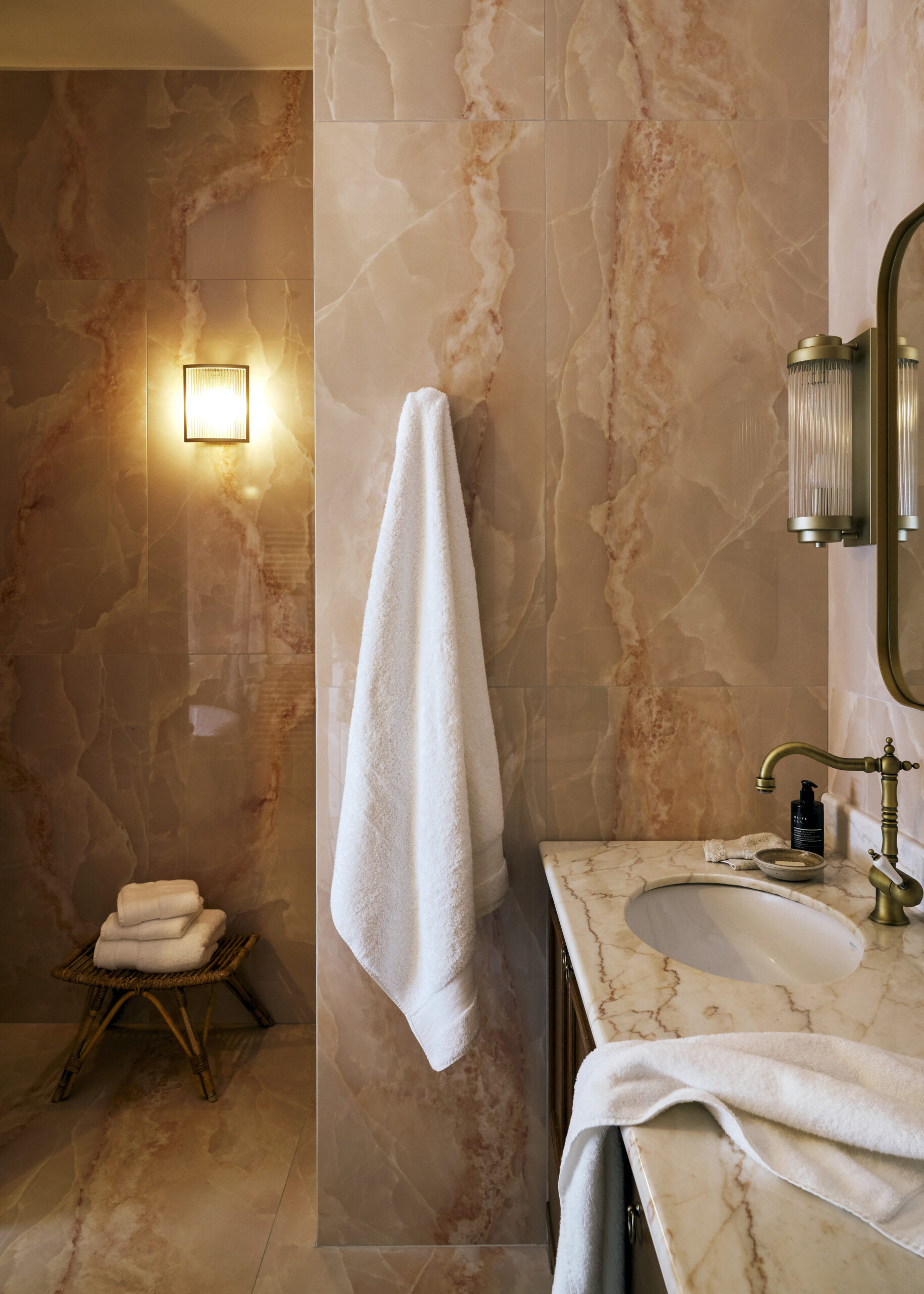 | Και στα δύο μπάνια, ο σχεδιασμός ισορροπεί ανάμεσα στη φυσική κομψότητα και τη διακριτική πολυτέλεια. Ο πράσινος και ο ροζ όνυχας εκφράζουν δύο διαφορετικές αποχρώσεις της ίδιας φιλοσοφίας: την αρμονική συνύπαρξη της γήινης υλικότητας με τη φωτεινότητα και τη ροή του νερού. Οι προσεγμένες λεπτομέρειες, οι μπρονζέ μπαταρίες, οι ανάγλυφες υφές και οι χειροποίητες επιφάνειες αποτυπώνουν μια αίσθηση αρχοντικής φινέτσας. Εδώ, ο σχεδιασμός δεν προσπαθεί να εντυπωσιάσει· αναδεικνύει με φυσικότητα τη μοναδικότητα των υλικών και μετατρέπει τον χώρο σε εμπειρία ευεξίας, αισθητικής και ισορροπίας. |