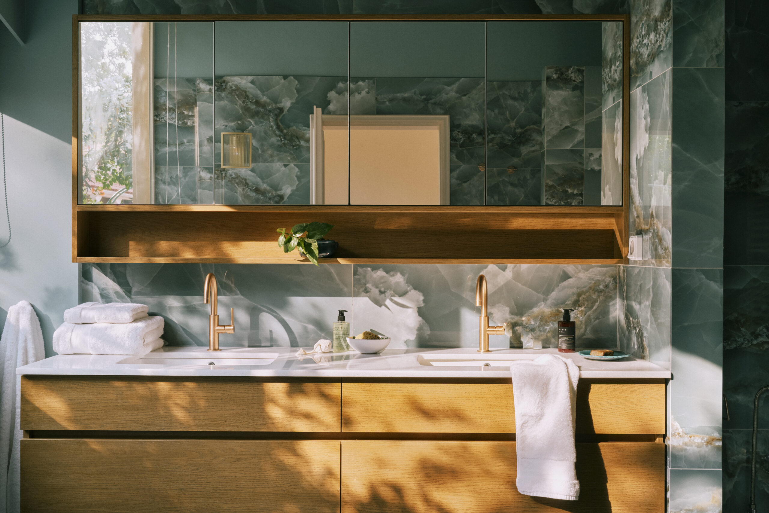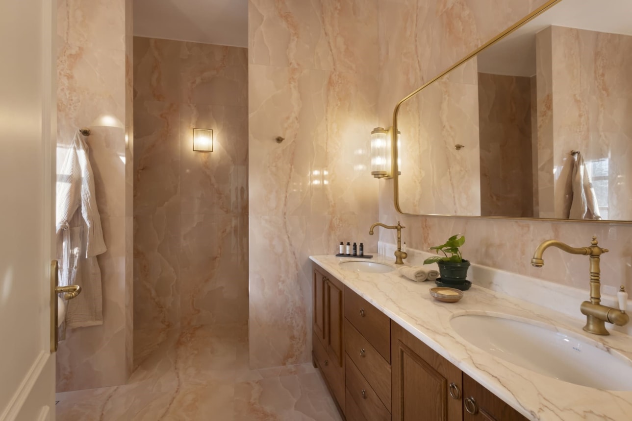 Το διπλό έπιπλο μπάνιου από φυσικό ξύλο συνδυάζεται αρμονικά με τα πλακίδια όνυχα στους τοίχους, δημιουργώντας μια ισορροπία ανάμεσα στη ζεστασιά και τη διαφάνεια. Οι δύο νιπτήρες προσδίδουν λειτουργικότητα και συμμετρία, ενώ οι χάλκινες μπαταρίες (Mate Rose Gold) προσθέτουν μια πινελιά εκλεπτυσμένης πολυτέλειας που ολοκληρώνει την αισθητική του χώρου. |